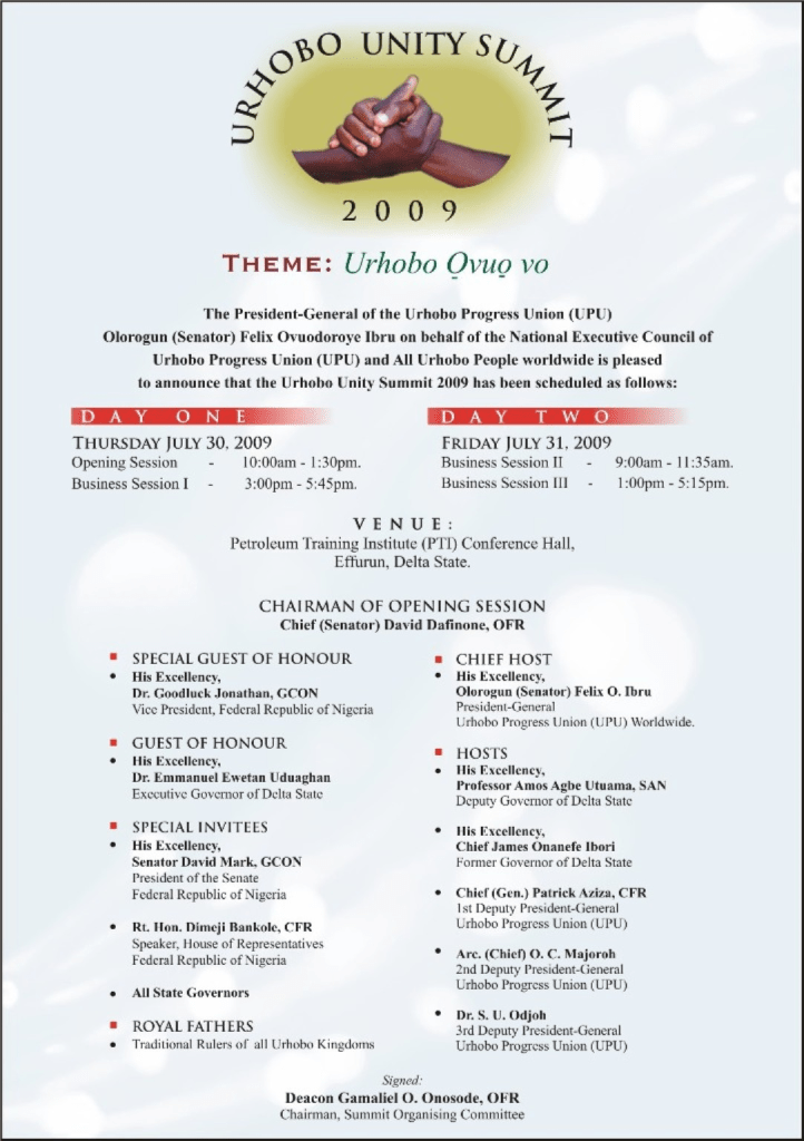 Announcement Urhobo Historical Society Announcement of Urhobo Unity Summit, 2009 Share this: Click to share on X (Opens in new window) X Click to share on Facebook (Opens in new window) Facebook Like Loading...