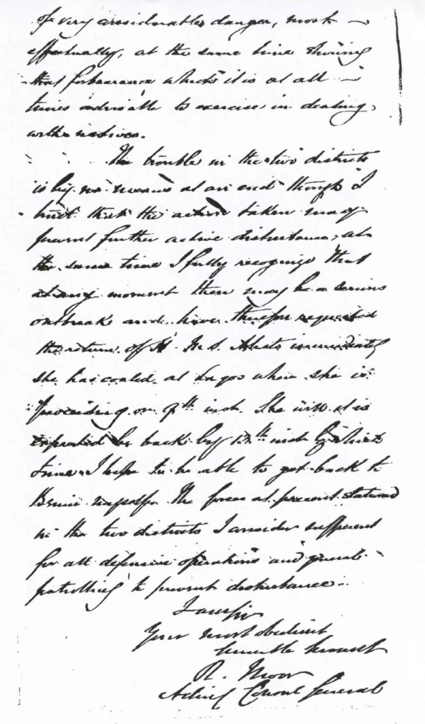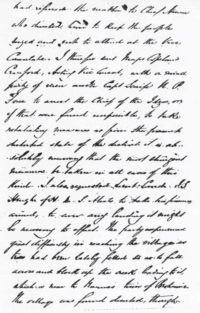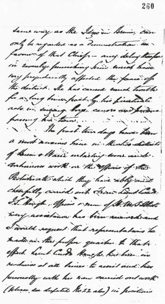 This hand-written letter explains British agents’ grounds for the growing hostility between British interests and Chief Nana Olomu, who was once a British ally. Unfortunately, the writing is virtually illegible. Other documents in this series make the same point. Those not particularly interested in the text may wish to skip reading this document.