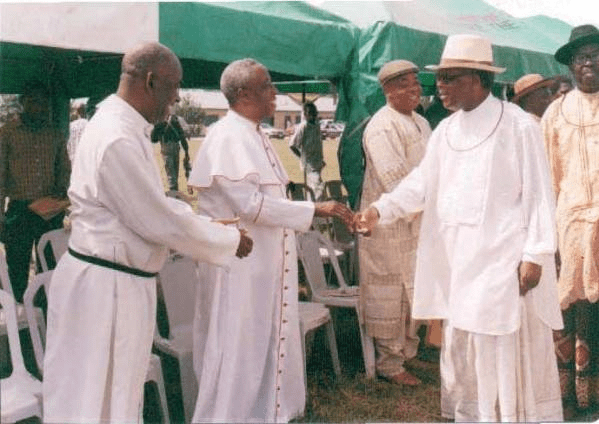 At the venue of the Thanksgiving ceremonies, Olorogun Ibru greets old friends. Here he chats with Monseigneur Anthony Erhueh and Reverend Professor Samuel Erivwo, co-celebrants of the ecumenical services of the day.