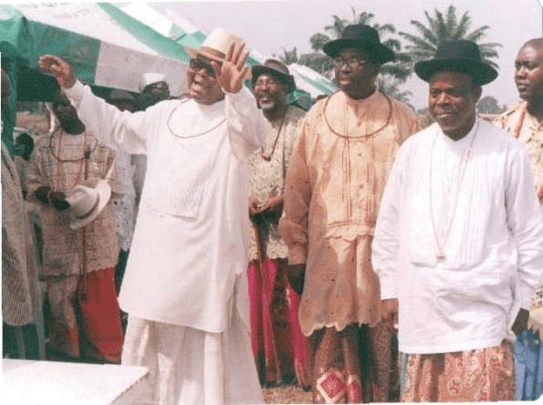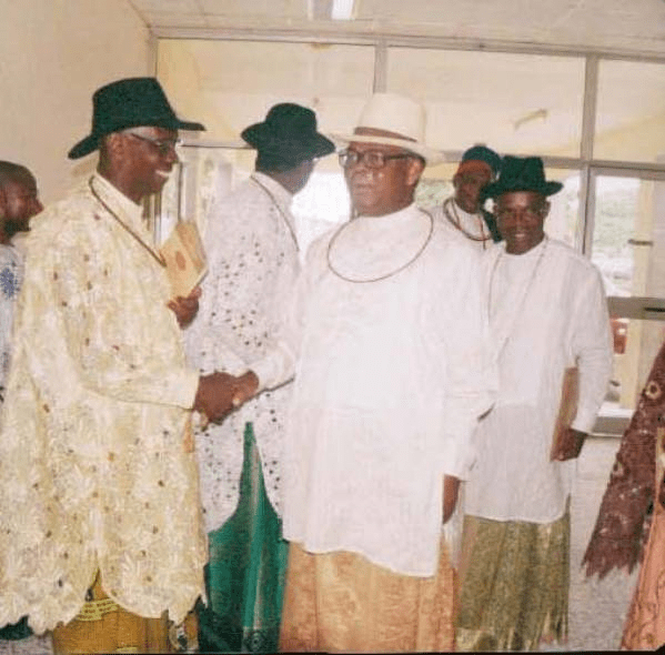 Olorogun Felix Ibru greets three Urhobo kings. They are (from the left) His Majesty Orhueh I, Orodje r’ Okpe; His Majesty Okpara I, Ovie r’ Agbon; and His Majesty Ogoni-Oghoro I, Owhorode r’ Olomu.