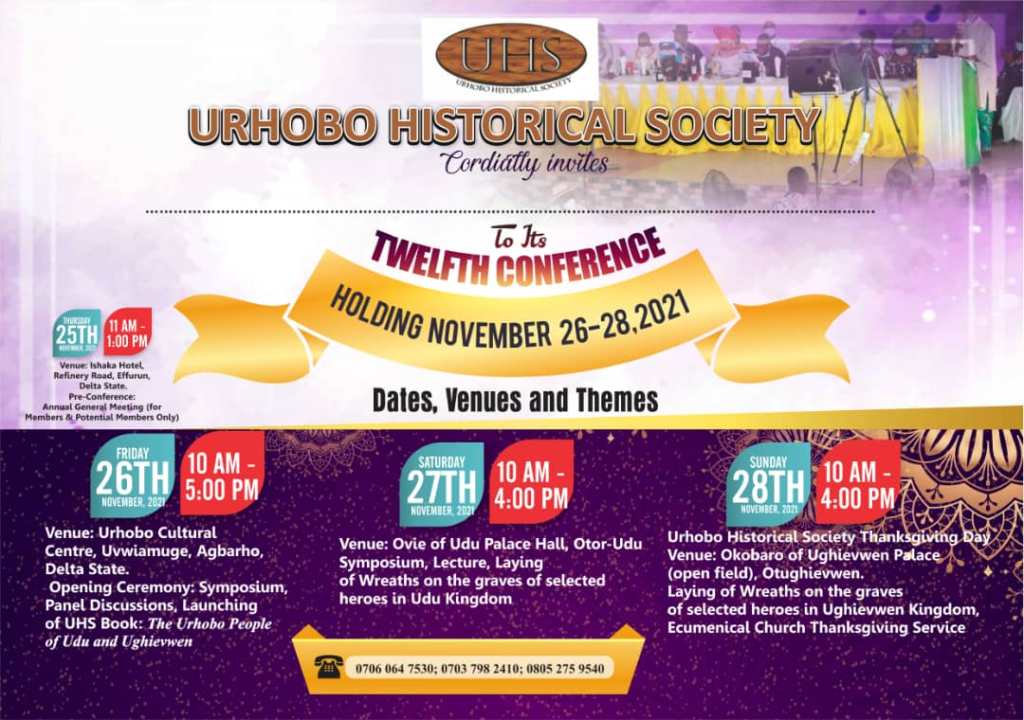 2. Organizing Annual Conferences and General Meetings for presentation and discussion of papers and research work on Urhobo history and culture, review of UHS activities and discussion of policy issues affecting the Urhobo people. The conferences bring together intellectuals and scholars, both Urhobos and non-Urhobos, who are interested in advancing the study of Urhobo history and culture. So far, twelve annual conferences and general meetings have been as follows: