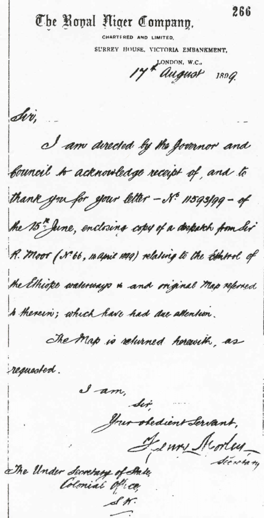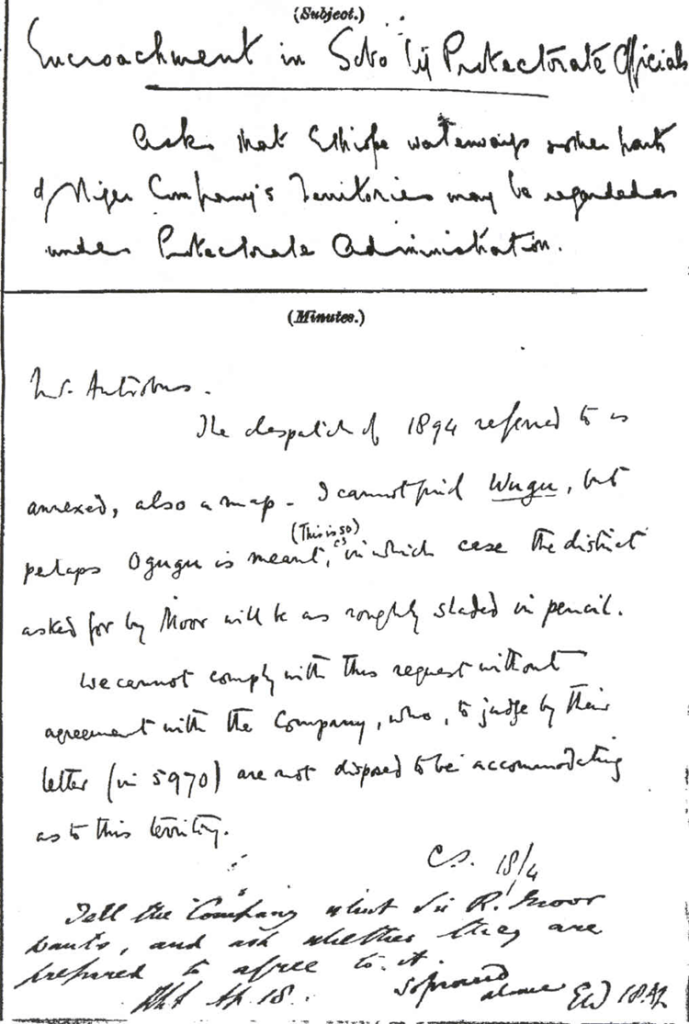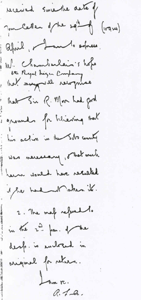| TEXT OF A TELEGRAPHIC MESSAGE FROM CHAMBERLAIN, SECRETARY OF STATE IN THE FOREIGN OFFICE IN LONDON, CONVEYING APPROVAL OF TRANSFER OF URHOBO COUNTRY FROM THE SPHERE OF THE ROYAL NIGER COMPANY |