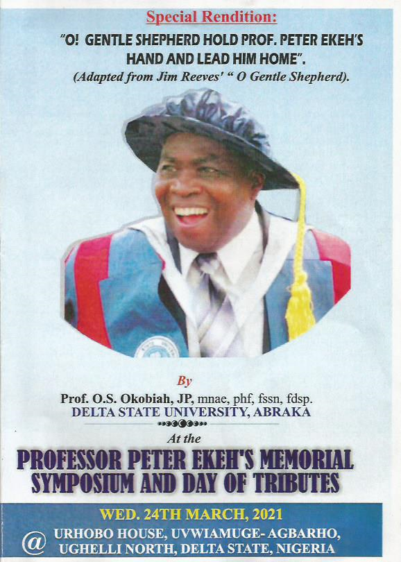 I want to thank Professor Sam Oyovbaire, former Federal Minister of Information for accepting to chair this occasion; Chief Johnson Barovbe who for many years coordinated the affairs of the Urhobo Historical Society (UHS) in our Homeland. Also, I want to thank Professor Eghosa Osaghae, a former and favorite student of Professor Ekeh and former Vice-Chancellor of Igbinedion University, Okada, Edo State for accepting to give the keynote address.