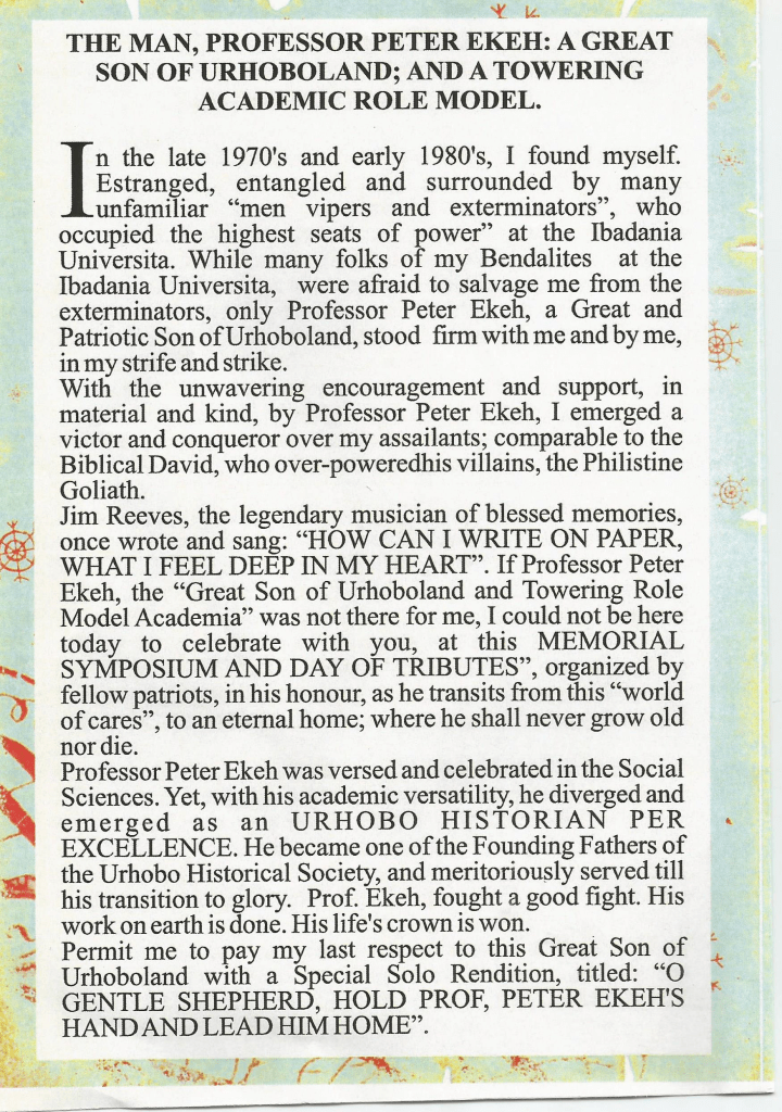 Professor Ekeh was a great and quintessential historian who through his teachings, writings, seminars and conferences created the awareness of Urhobo history and culture – He was an erudite and cerebral scholar and nationalist and the event(s) of today are apt and befitting.